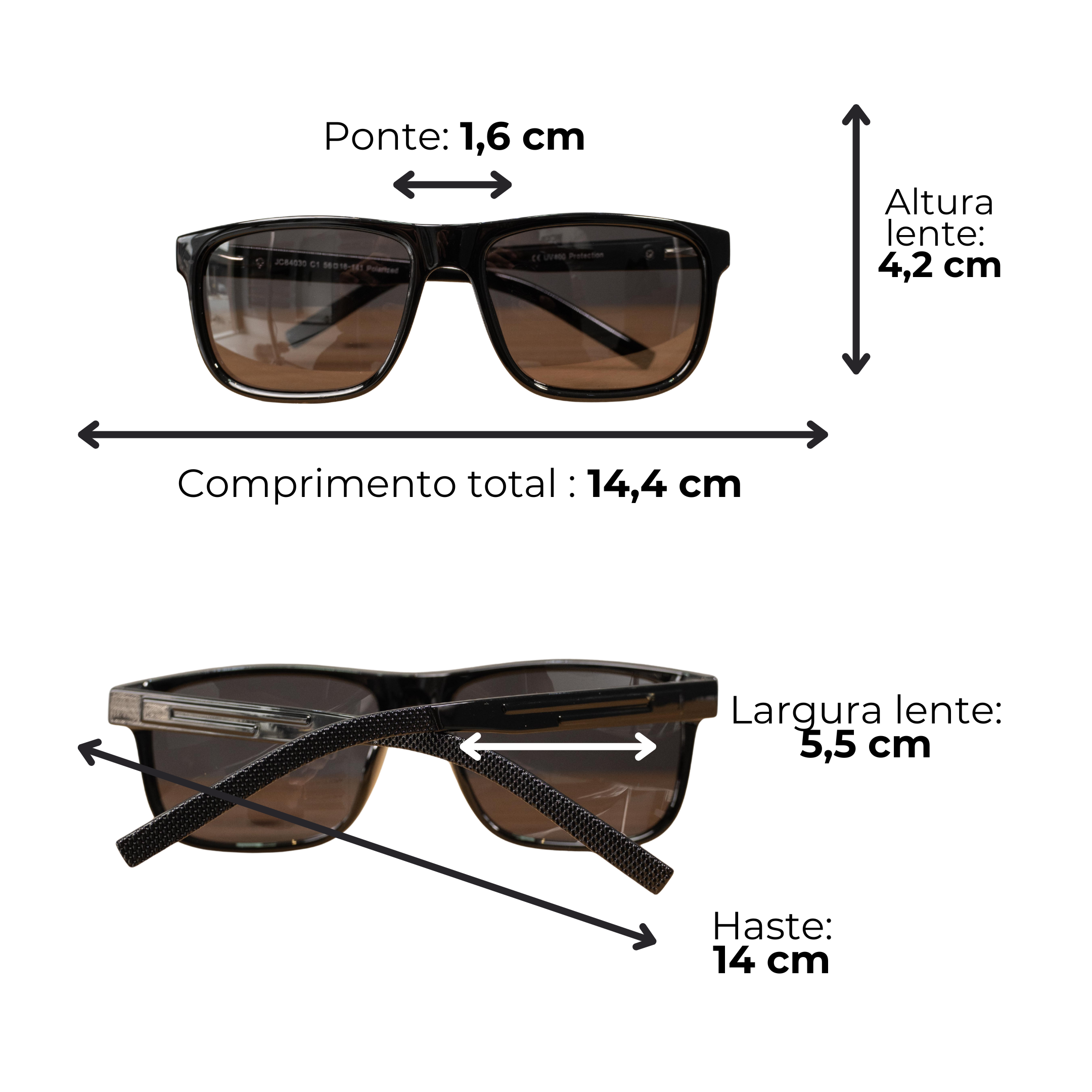 • Lentes polarizadas com proteção UV400: Reduzem reflexos, aumentam a nitidez e garantem muito mais conforto visual mesmo nos dias mais ensolarados.